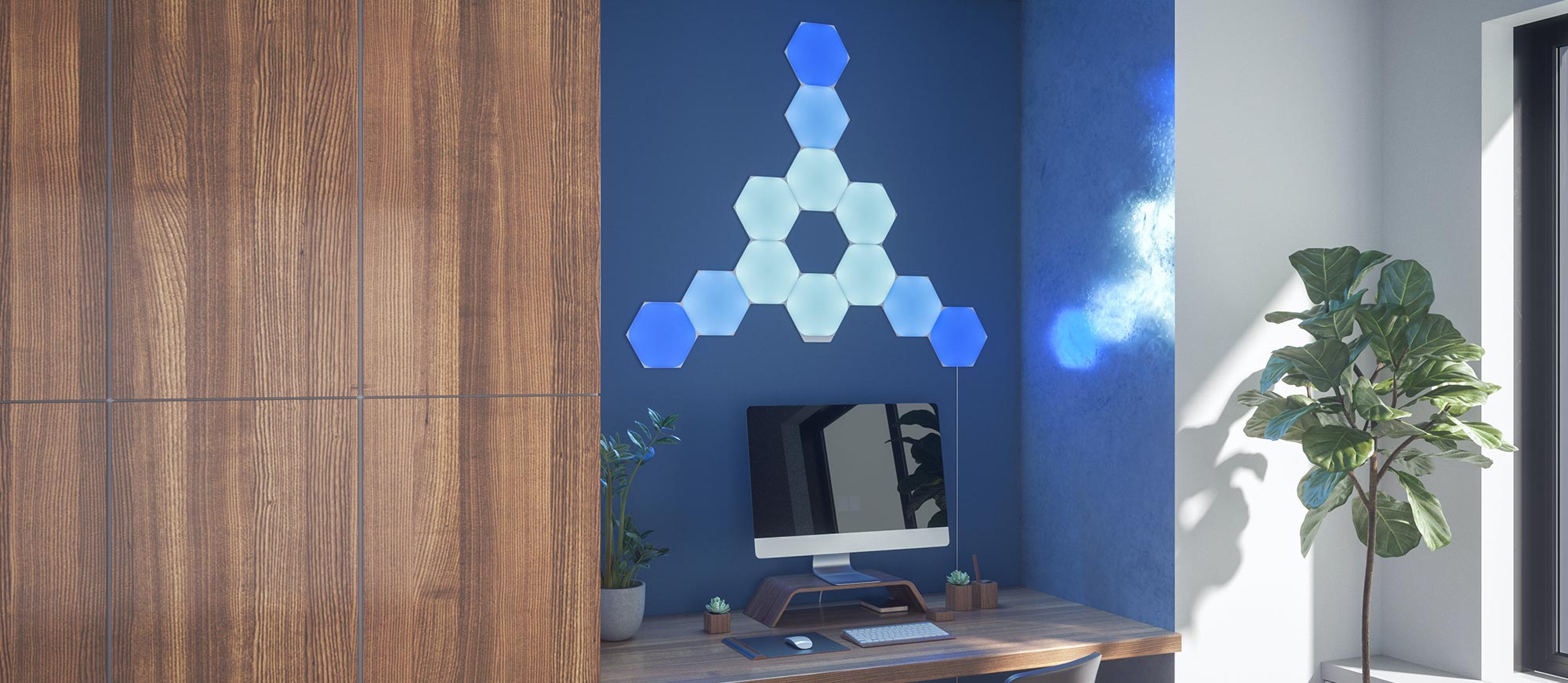 The Nanoleaf decorative elements are wall lighting panels that have a wood effect textured finish.