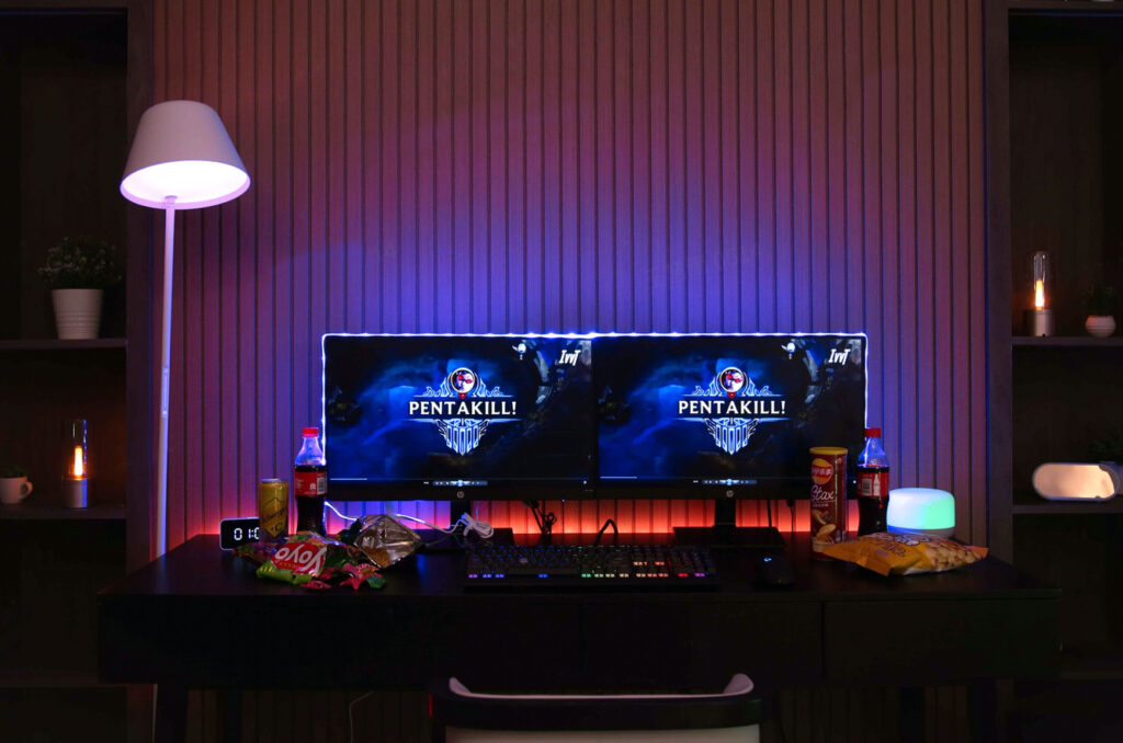 Players want to be immersed in the game’s world and experience its mood while they play. The use of RGB colored light in lighting design applications is best for generating a cool ambiance. Cool colors like blue, green, and purple should be used when creating a cool vibe. And if you look at the luminaires, you’ll see that gaming rooms tend to be decorated with a lot of light strips. This is because light strips’ linear impact might amplify the feeling of modernity. In addition, to establish the ambiance, gaming room light fixtures often include colored light strips behind the monitor.