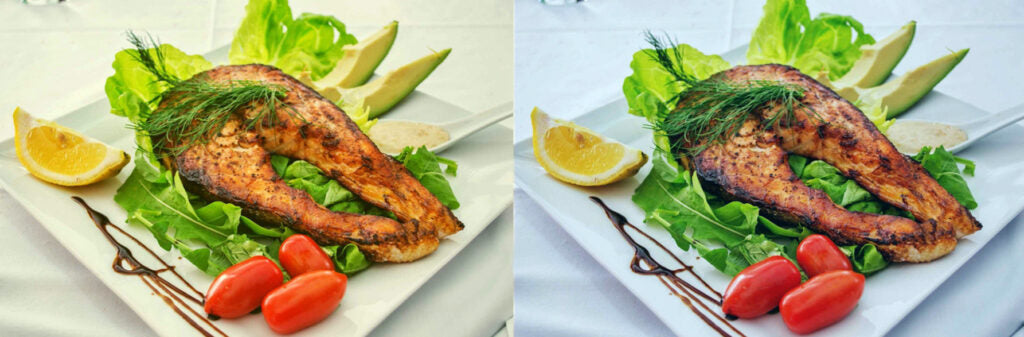 Color, flavor, taste and form are all important for a dish, with “color” taking precedence. If exposed to cool light, i.e. high color temperature light, it will directly affect the “color” of the dish and therefore the appetite. For this reason, the majority of restaurants use warm light sources (Fig. 4). Typically, high-end restaurants will choose luminaires with a color rendering index Ra ≥ 90. As shown in Fig. 5, the higher the color rendering index, the more realistic your food will look when viewed in artificial light, enhancing your eating experience.