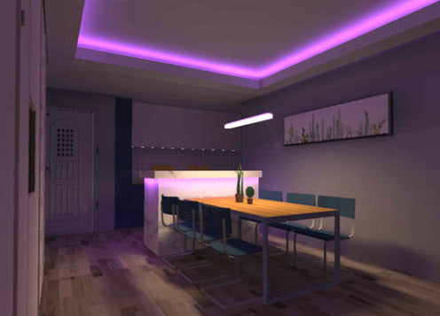 Why do restaurants dim light? If a couple wants to enjoy a romantic candlelight dinner or Western dinner at home, you can learn from the lighting design of the Western restaurant environment. Lower the overall restaurant ambient light (dim or turn off spotlights) and tune the chandelier above the dining table to a lower color temperature, the ceiling of the colored light strip can be adjusted to romantic purple to spice up the atmosphere (see Fig. 29).