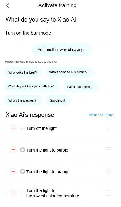 Open the Xiao Ai App and enable training as shown in Fig. 33 to see an example of Xiaomi smart speaker settings. To begin with, customize the voice control by adding commands such as “I’m going to eat,” “Start western dining mode,” and “Start bar mode”. After that, include control protocols in your device. The lights can be set to different modes based on the spoken instructions that are issued to the voice speaker.