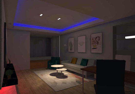The general lighting of a living room contains downlights, spotlights and strips to meet fundamental lighting needs. Colored light strips can be the backbone of the ambience for the movie mode while working as basic illumination. Wall washers may be used to brighten the TV wall and the wall behind the sofa.