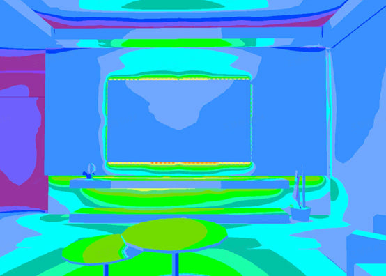 Fig. 5 Pseudo-color diagrams of the lighting effects and illuminance for the “movie mode”