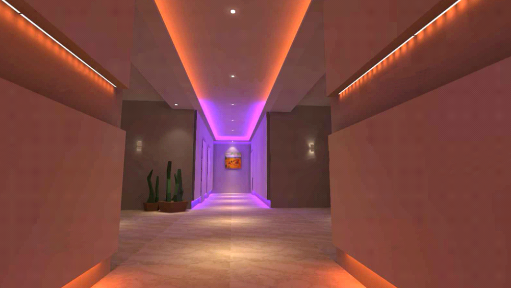 Group the spotlights and the ceiling light strips separately; the light strips near the end of the corridor (e.g. 3m on each side of the ceiling) are a purple light zone and the light strips near the doorway (e.g. 2m on each side of the ceiling) emit orange hue.