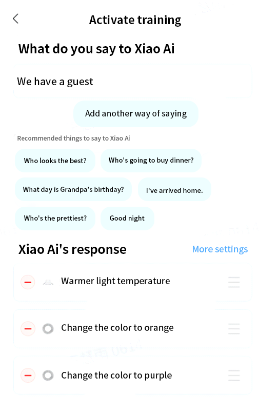 Fig. 38 Voice control commands and luminaire control rules for a welcoming mode (Image source: Xiao Ai app)
